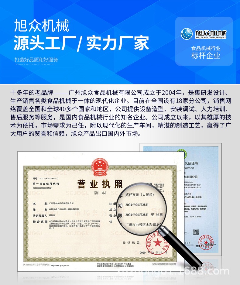 廣州旭眾(zhòng)食品機械有限(xiàn)公司是一家集科研開發(fā),生產設計,營銷服務為一體(tǐ)的現代化生產企業。現代化生產車間,精湛製造技術(shù),所產機械曆(lì)經市場重重考驗,不斷贏得海內外客戶的讚譽(yù)。